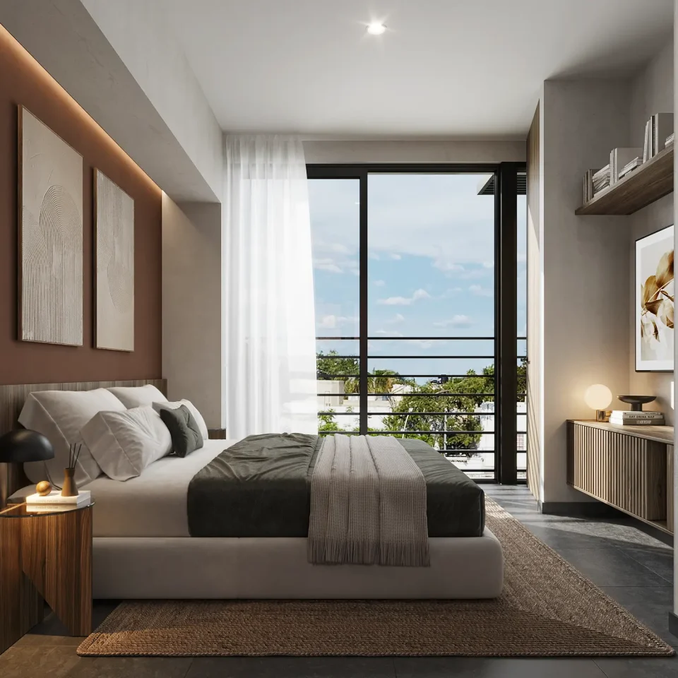 El departamento PAX ofrece un diseño moderno y eficiente, con cocina abierta, dormitorio acogedor, baño privado y una sala luminosa, ideal para parejas o solteros.